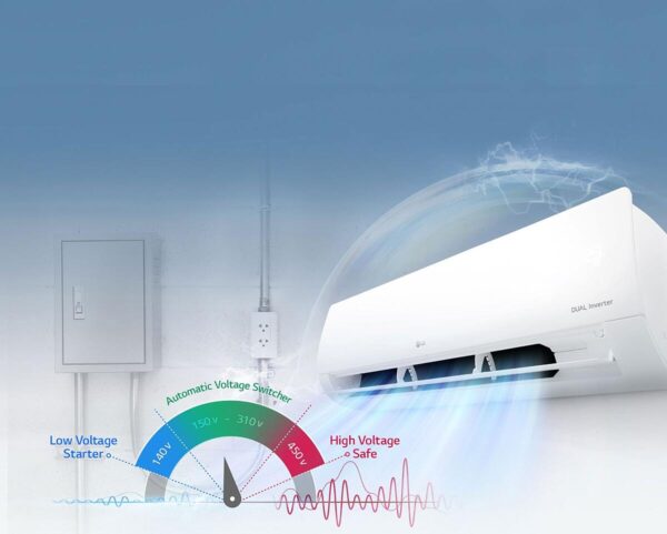 Volt Care protects an air conditioner from potential damage caused by voltage fluctuations. It is composed of LVS(Low Voltage Starter), AVS(Automatic Voltage Switcher), and HVS(High Voltage Safe) technologies. LVS and HVS protects the unit from low and high power supply and AVS allows for stable operation during voltage fluctuation range.
