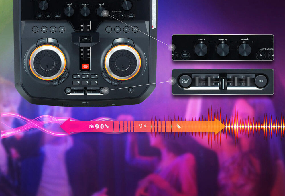 Crossfader is no longer the preserve of professional DJs. LG XBOOM CK99’s Crossfader makes your mixing perfect. By simply moving a level, it makes a smooth transition between two audio files. You can also control and sync the tempo of 2 tracks.