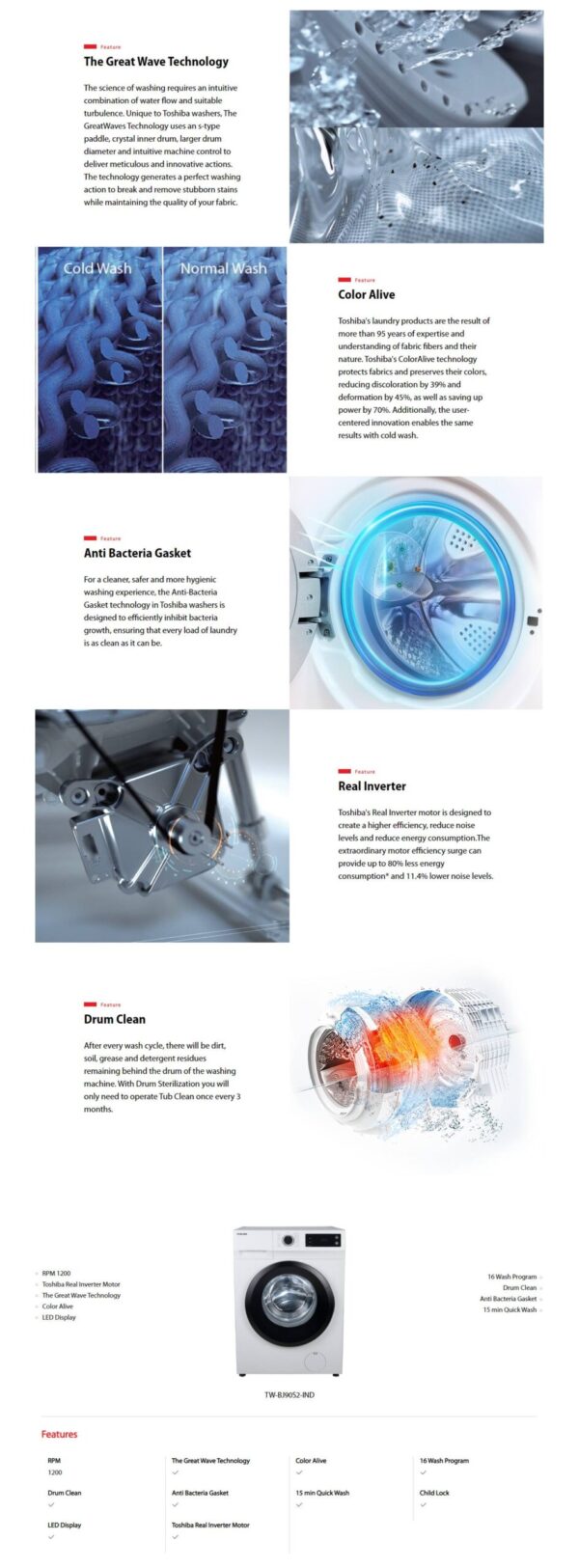 This Toshiba 8kg Front Load Washer-Dryer Combo is powered by 5 technology which are: First is the GREATWAVES™ technology is developed based on Flush Wave and Cold Wash, which leads to great savings and color-protecting performance for laundry.